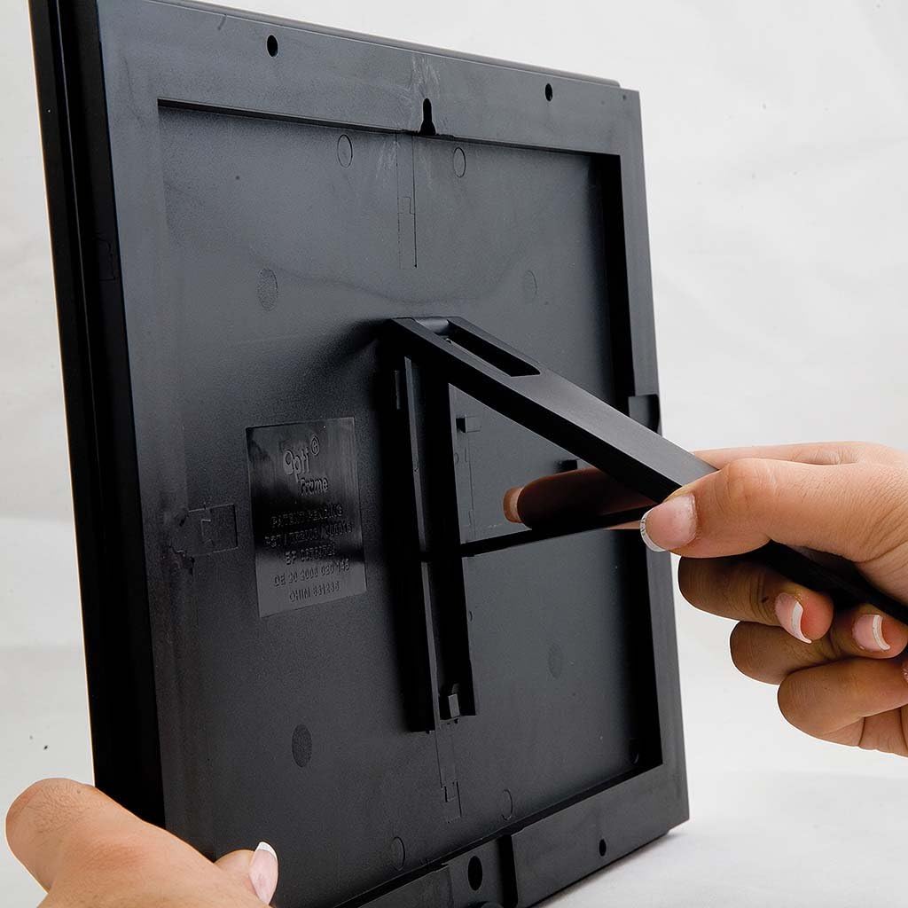 - GENUINE SNAP FRAME: Opti Frame is M&T Displays's patented (US 2009/211134) Snap frame which eliminates the flaws of standard snap frames. Instead of using plain back cover, we use textured durable plastic casing which has ready for wall mounting with 2 holes on both long sides. Wall hanging is also available with wall hanger holes placed on short and long sides.
