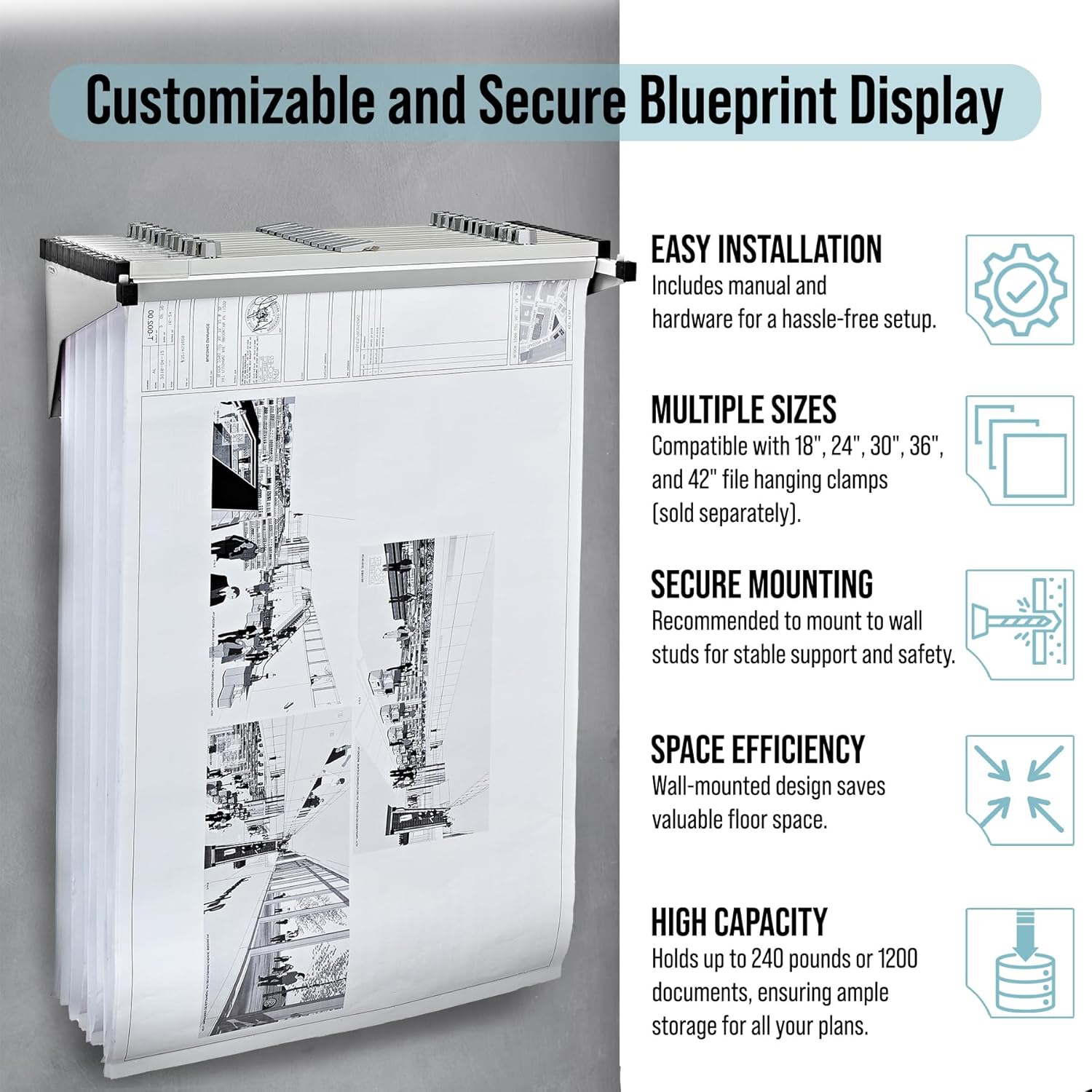 - Sturdy Blueprint Storage Organizer: The Adir blueprint hanging rack offers both durability and simplicity. Constructed from robust steel, our blueprint stand presents a polished appearance that can support up to 240 pounds or around 1200 documents.
