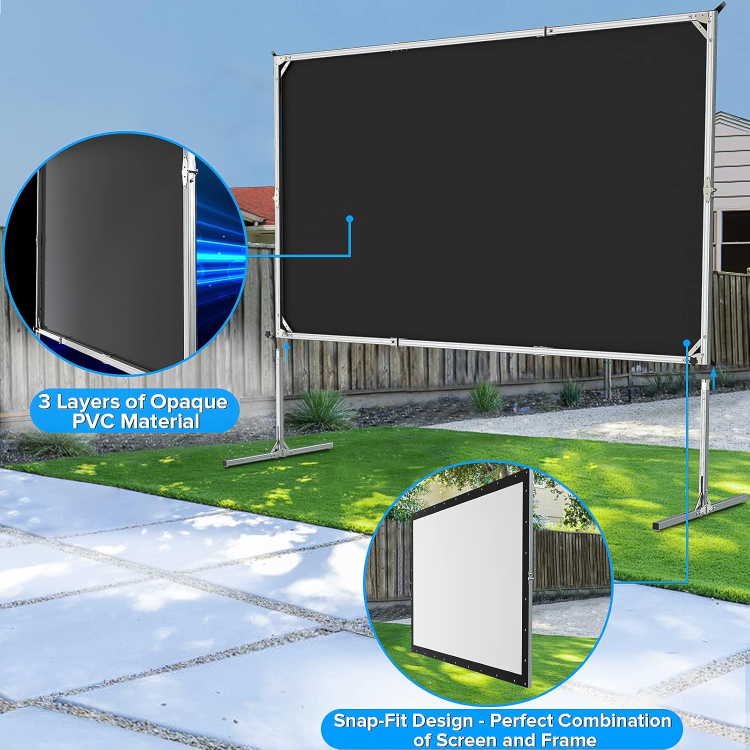 - ▶【Stable Stand Wrinkle Free Screen 】Premium PVC Matte makes the projector screen wrinkle-free and easy to clean. And the frame is durable for freestanding in light wind for outdoor use. The Stability-Ensure Kit is included: 4 ground stakes, 2 rigging cords, and 2 support rings. You won't have to worry about the frame or legs bending or breaking in the wind.