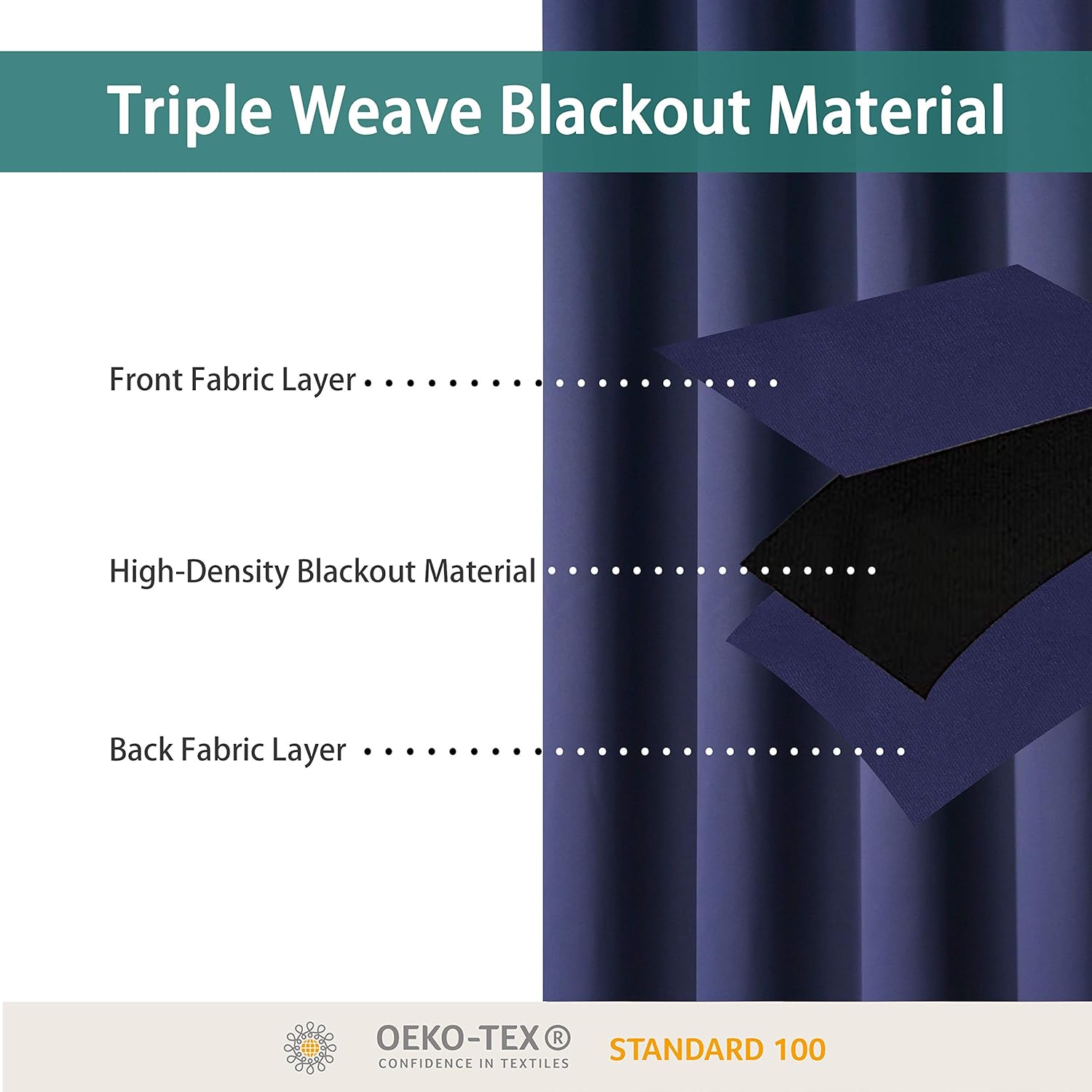 - PREMIUM BLACKOUT MATERIAL: Our room darkening curtain is made of 100% polyester fabric and have the same color with the front and back. Crafted in a certified STANDARD 100 by OEKO‑TEX factory from a durable soft and thick triple weave blackout fabric which block out 90% above sunlight and UV rays. Darker colors work better.