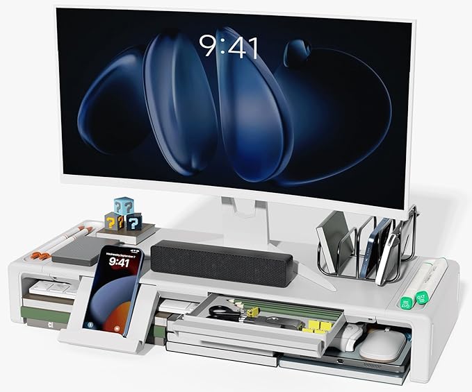 OImaster Monitor Stand Riser, Foldable Computer Monitor Riser, Adjustable Length Computer Stand and Storage Drawer & Pen Slot, Phone Stand Compatible Computer, Desktop, Laptop, Save Space (White)