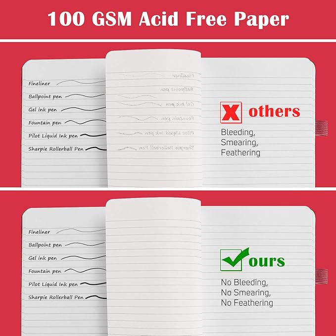 - Fountain Pen Paper: No Bleeding through for most ink pen is our paper's rigorous standard. After hundreds of test, we apply upgraded 100 GSM off-white Acid Free Paper, which helps write smoothly without ghosting, smearing and avoid eyes tiredness.