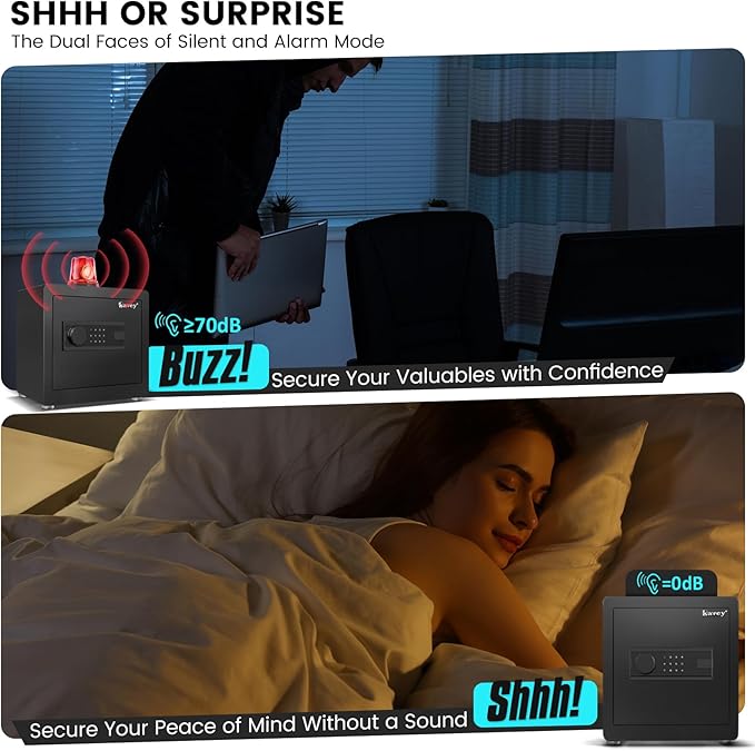 - POWERHOUSE OF SAFETY, DUAL ALARM MASTERY - Safety isn't just a word, it's a promise that the Kavey Home Safe fulfills effortlessly. Our money safe comes armed with a dual alarm system, striking at the heart of theft and curious little hands. Three incorrect password attempts or any forceful breach triggers the safe into action. The result? A resounding 70-decibel alarm that echoes through the space, enough to deter even the most audacious intruders.