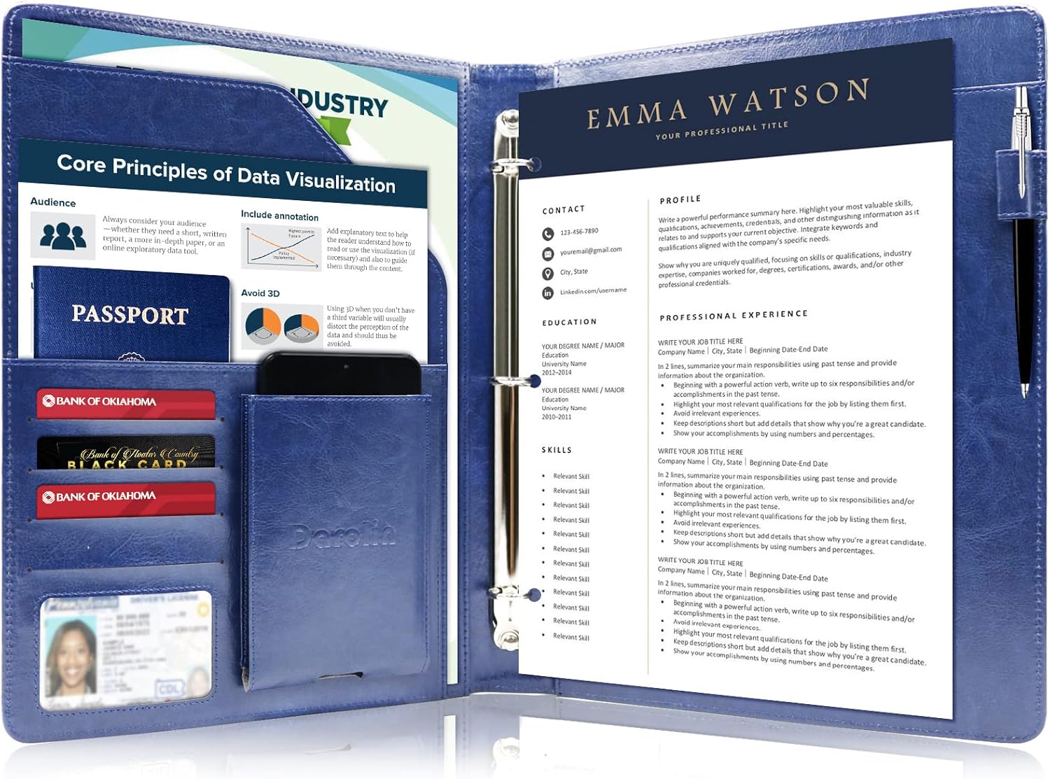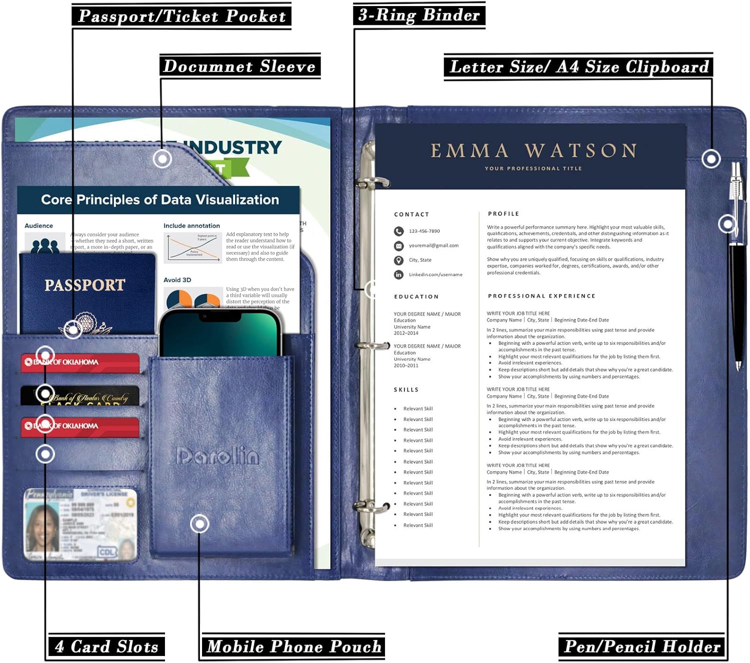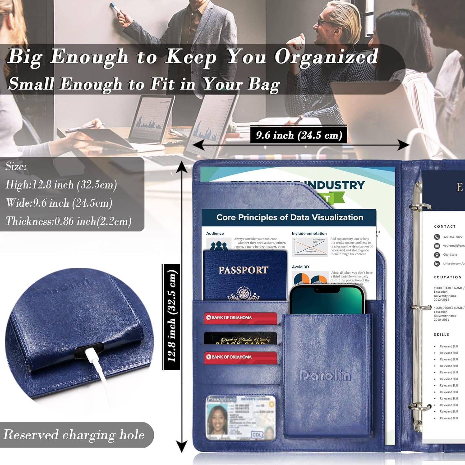 - [PRACTICAL & ORGANIZED] Darolin Portfolio Binder 3 Ring case designed with one Stainless Steel 3 Ring Binder, Pen Loop, Cell Phone Holder, File pocket, Bill Pocket and 4 Card Holders. Various inside pockets and slots capable of holding documents, letters, notes, envelopes, mobile phone, pens, business cards and other stuffs, which facilitate your daily use and business travels, make your work or study more efficient, which brings great convenience in daily life.