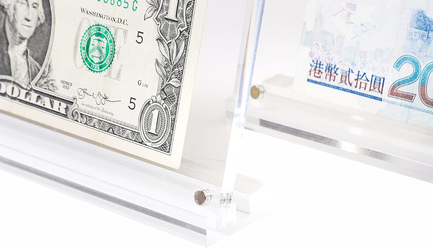 - WIDELY USED: Clear 7.3x3.5 inch acrylic frame with base supports,designed for photos,paper currency,pictures,stamps,paintings or other paper items and arts,real estate licenses and bank checks; a smaller size picture or currency will leave a border for a floating effect and makes your bill display stand out,only for tabletop or desktop display