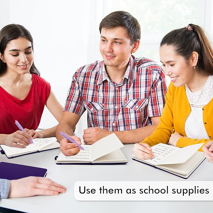 - Feela 12 Pack Classic Ruled Notebooks contains 12 purple ruled sturdy cover notebooks and 12 Black Retractable Pens. Each of the notebooks measures 8.3” x 5.1”, which is perfect to carry and easily held by young girls and boys. These black cute pens are customized to be placed in the pen holder, which is pretty convenient.