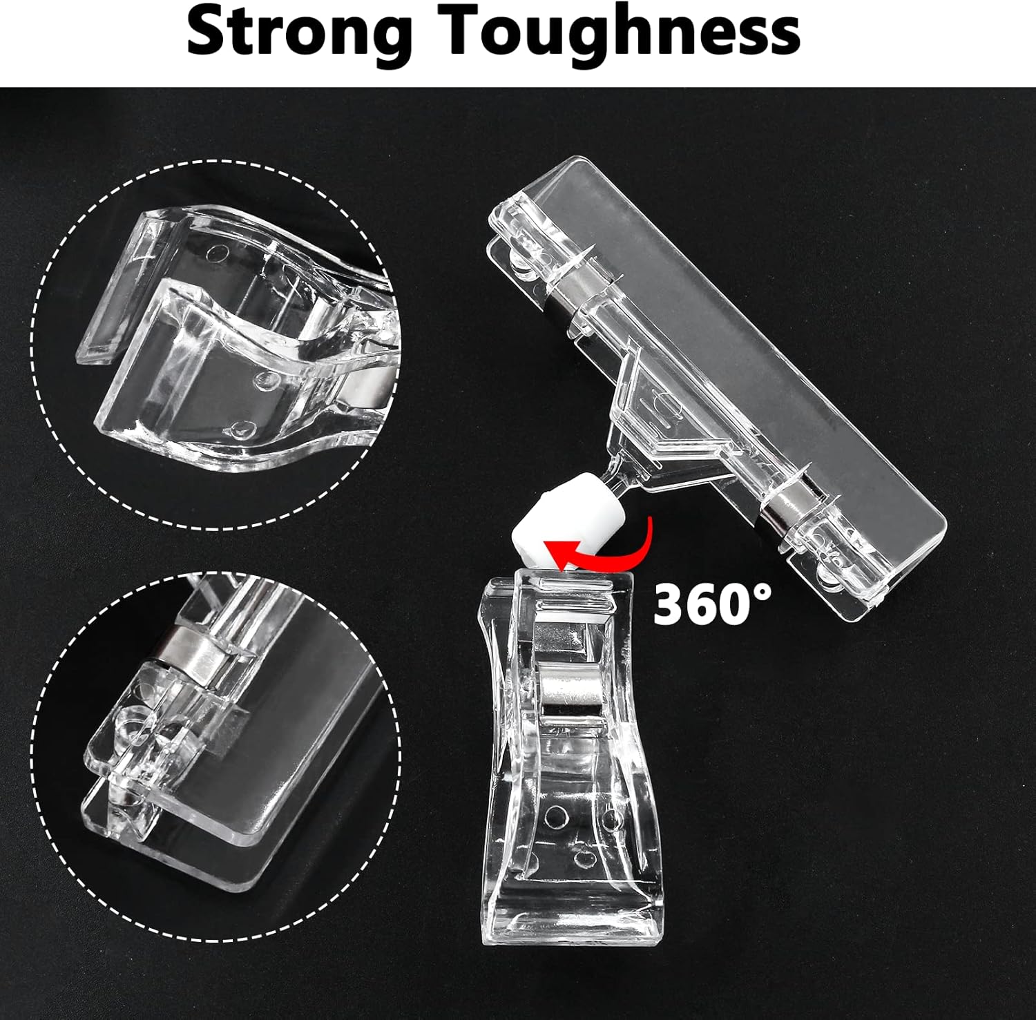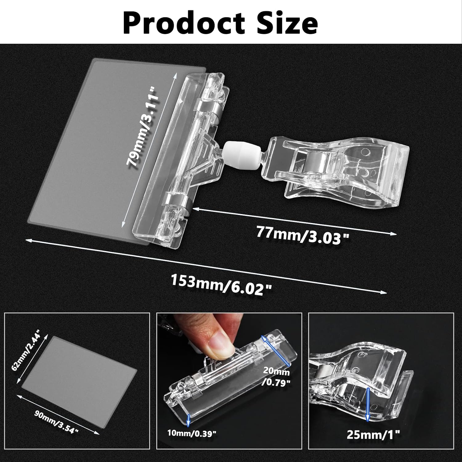 - High-Quality Material: Made of premium plastic, which is waterproof, dustproof, strong, reliable, and not easy to tear and damage. The label clip is very flexible and can be bent and rotated 90 degrees in each direction for the complete presentation.