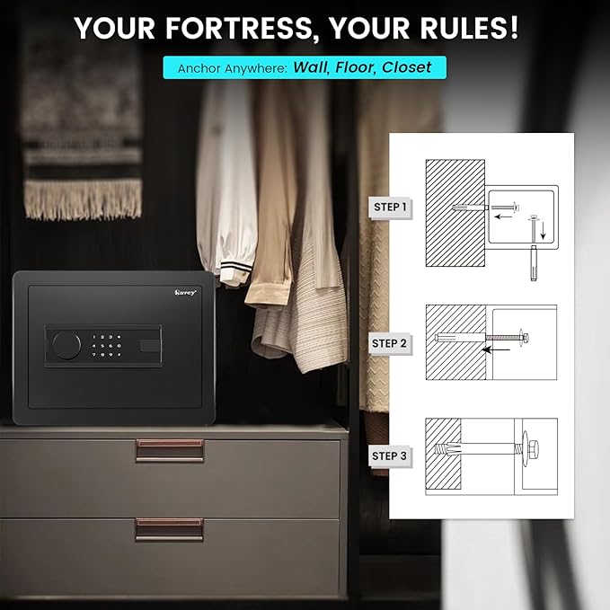 - SECURE AND DURABLE HOME SAFE - The Kavey safe is designed to keep your valuables safe with its 3 solid 20mm locking bolts, 60mm thick door, anti-collision and pry-resistant micro seam design. This safe can be fixed to the wall or floor using the included expansion screws for added protection against theft. Constructed of solid cold-rolled steel, gives this safe has excellent resistance to drilling, smashing and temperature changes.