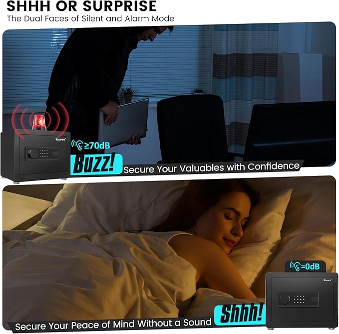 - DOUBLE ALARM SYSTEM - The home safe has a dual alarm system that activates after 3 consecutive incorrect passwords or violent vibrations, with a 70 decibel alarm sound lasting 60 seconds, audible throughout your home. The alarm can be stopped by entering the correct password.