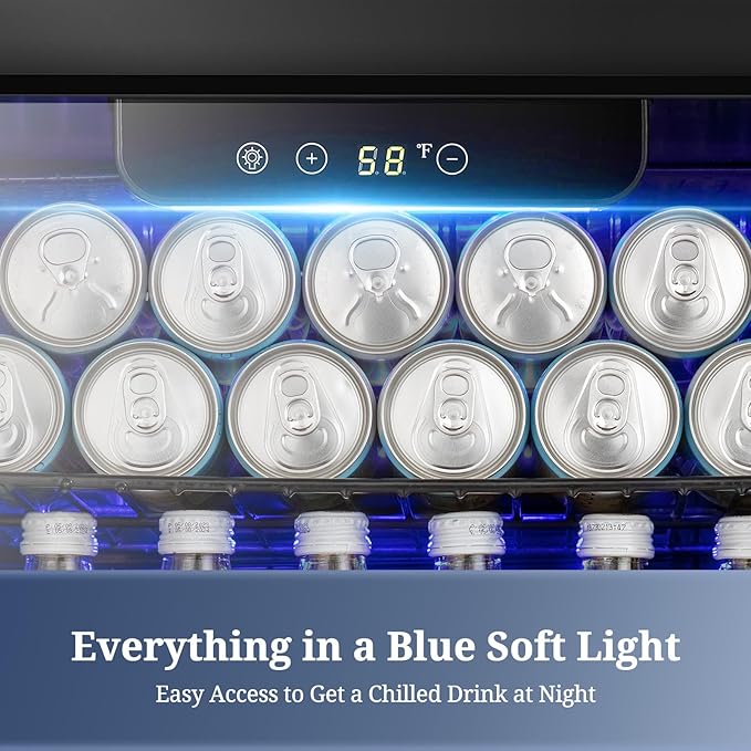 - Elaborate design:This Beverage cooler runs on a powerful but quiet compressor. Built-in blue LED light allows you to clearly find drinks even at night as well as makes your drink look more precious. It also has adjustable shelving for a variety of beverages