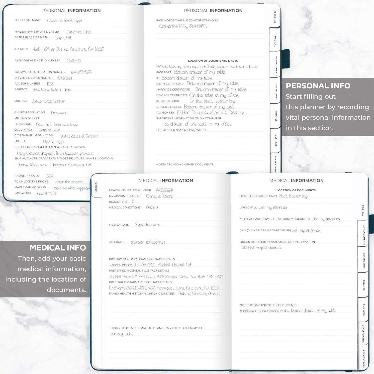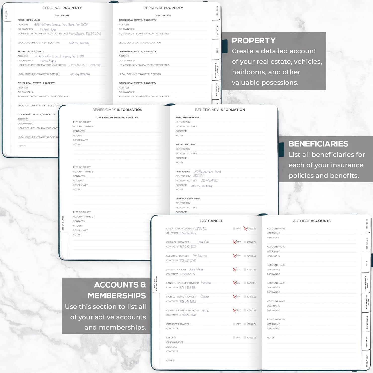 - MEDICAL & FINANCIAL INFO, INSURANCE POLICIES, ACTIVE MEMBERSHIPS & MORE: Inside this funeral planning workbook, you can add care instructions for dependents and pets, personal property, finance & business info, insurance policies, beneficiaries, and more.