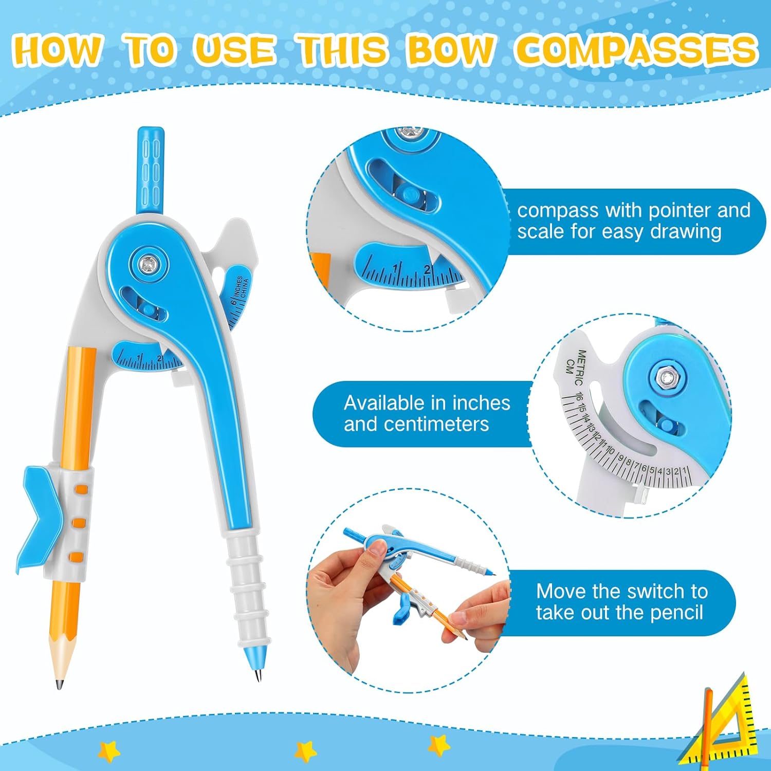 - Precise Dual Scale Design: these student compasses feature both centimeter scale and inch scale, allowing for accurate and convenient measurements; The design is suitable for geometry and math students who need to create circles, arcs, and angles for geometric shapes and calculations, making these compasses an essential tool for any math classroom