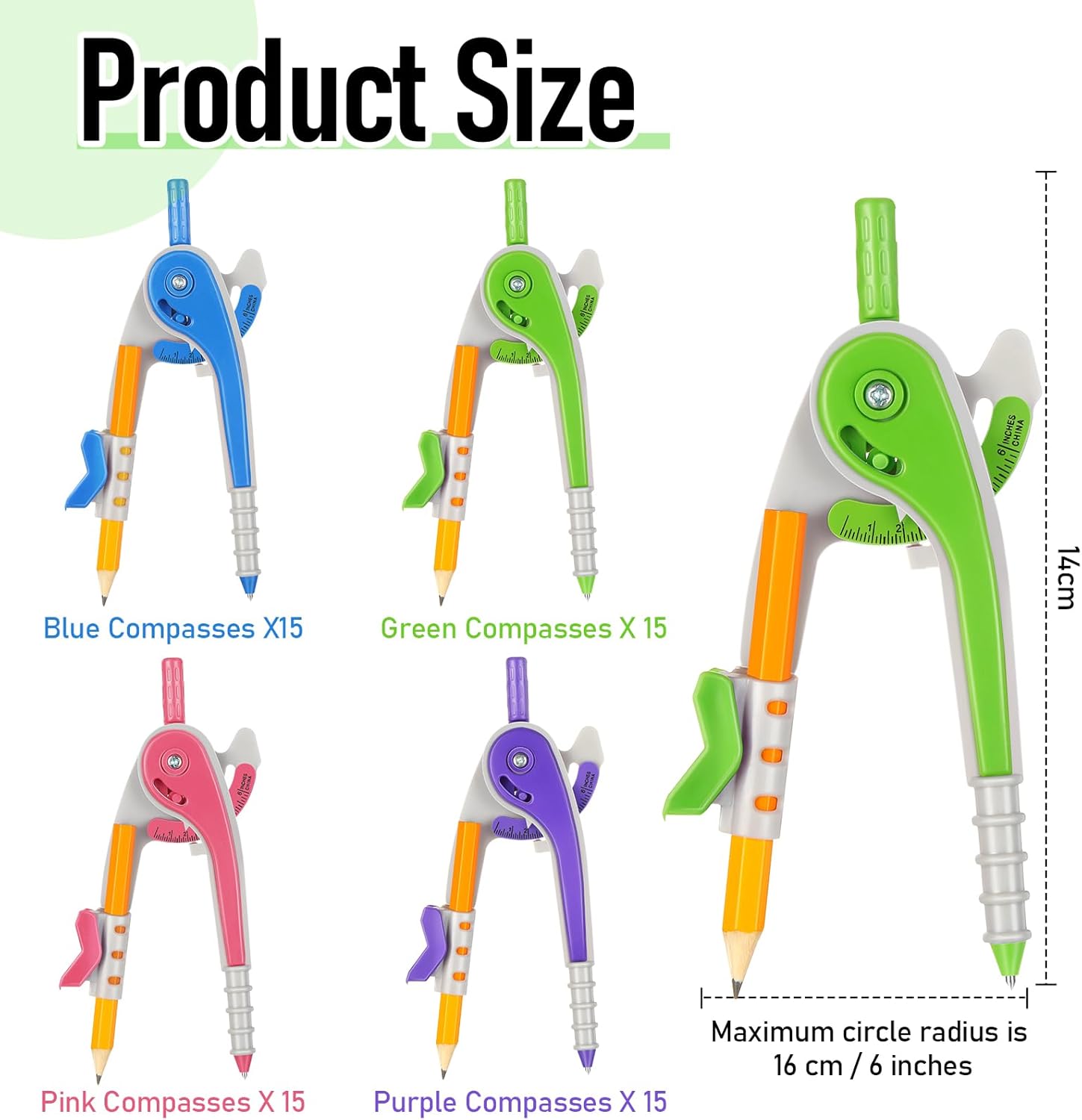 - Size information: with an overall length of 6 inches/ 15 cm, these compasses with pencil are in the right size for a wide range of applications; The included pencil is 3.54 inches/ 9 cm long and can be easily replaced when needed; Additionally, the compasses can help to draw circles with a maximum diameter of 6.5 inches, accommodate pencils, pens, and markers, and reproduce pens up to a diameter of 0.31 inches/ 0.8 cm, making them ideal for school projects and drawing