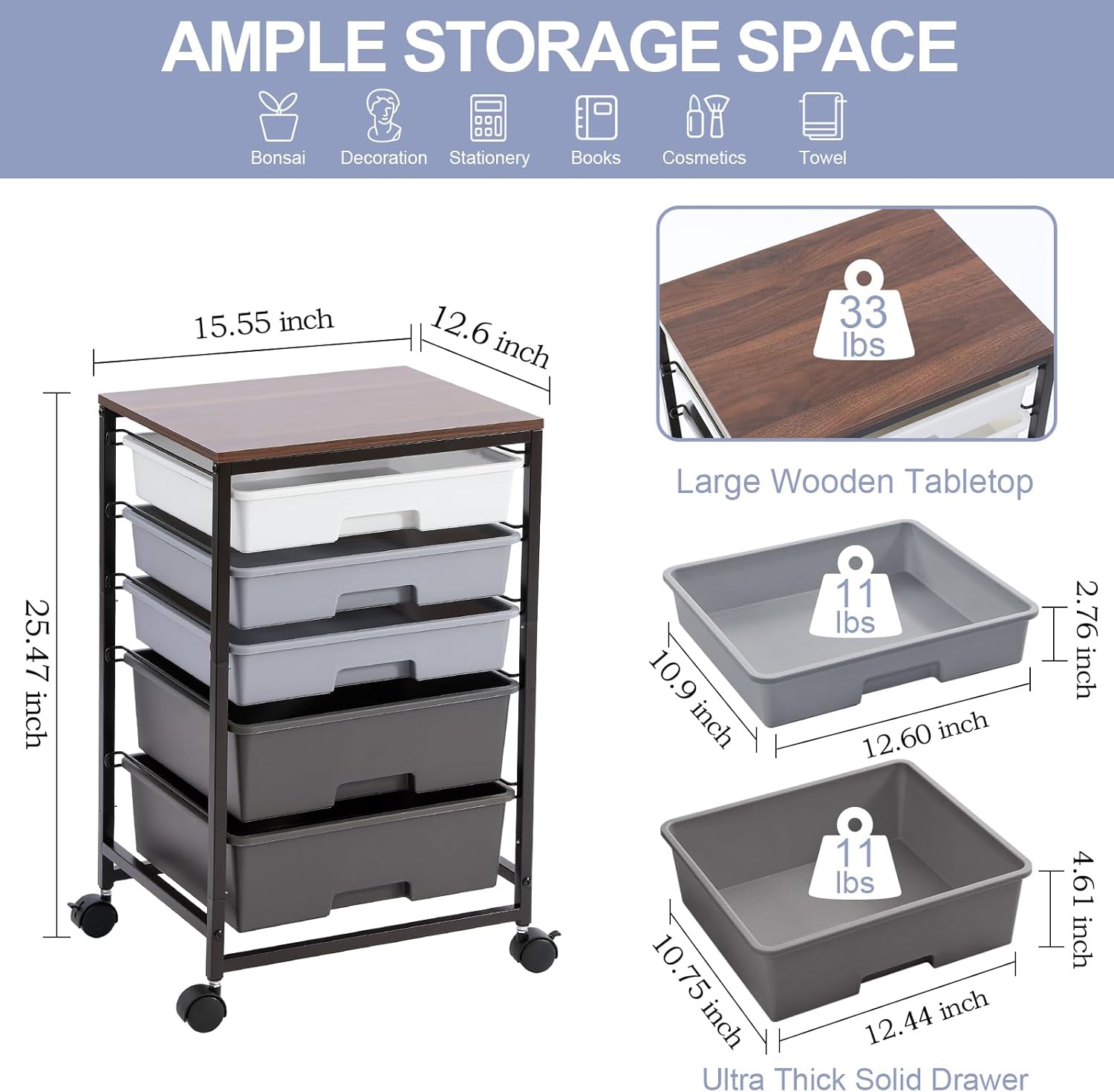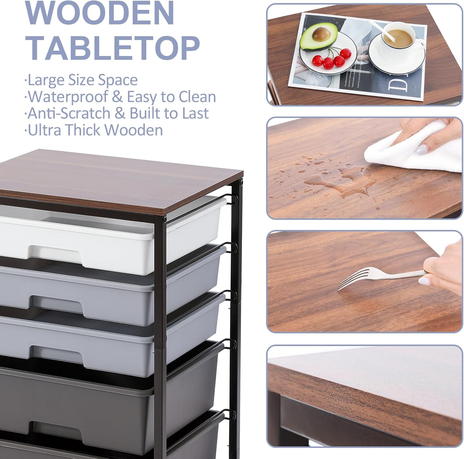 - WOODEN TABLETOP & THICK DRAWERS & METAL FRAME: The utility cart with drawer boasts a sturdy and durable powder-coated steel frame with water and rust resistance ensures a sturdy construction and built to last.Additionally, the slide-out drawers are made of durable PP material, which also boasts great durability.Holds 33 pounds on tits op plate and 11 pounds per drawer. This 5 drawer rolling cart will serve you for a long time.