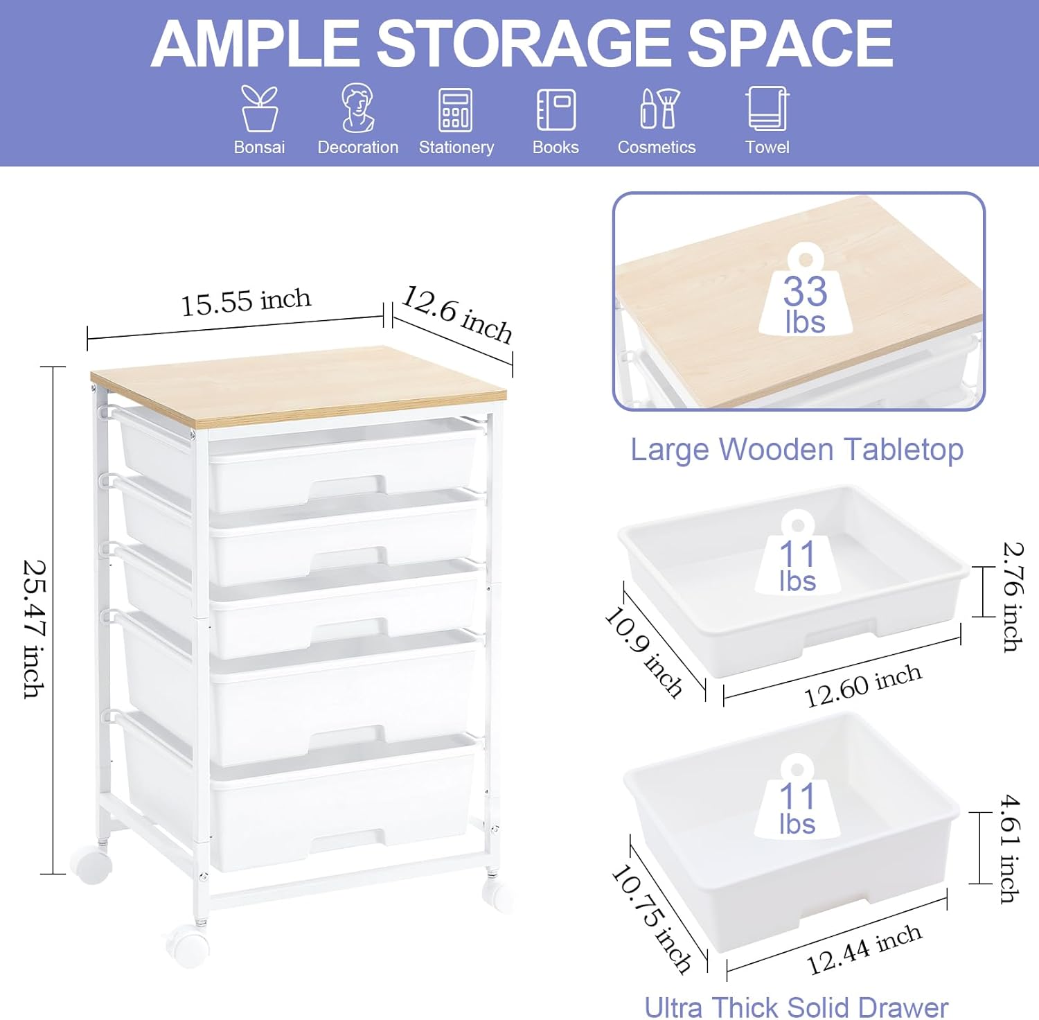 - WOODEN TABLETOP & THICK DRAWERS & METAL FRAME: The utility cart with drawer boasts a sturdy and durable powder-coated steel frame with water and rust resistance ensures a sturdy construction and built to last.Additionally, the slide-out drawers are made of durable PP material, which also boasts great durability.Holds 33 pounds on tits op plate and 11 pounds per drawer. This 5 drawer rolling cart will serve you for a long time.