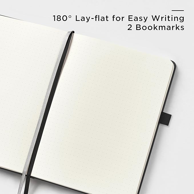 - 180° LAY-FLAT DESIGN: The lay-flat design allows for easy writing and ensures that you can utilize every page efficiently. Journaling, note-taking and planning has never been easier! 2 Bookmarks to help you find important content faster
