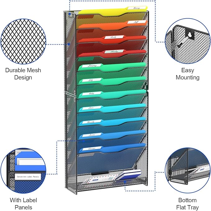 samstar 12 Tier Wall File Organizer, Hanging Wall Mount File Holder Paper Folder Mail Organizer, Mesh Metal, Black.