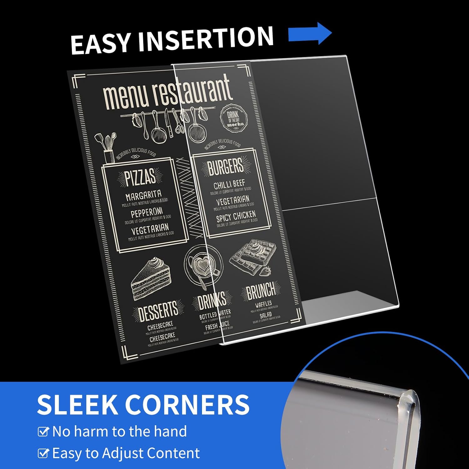 - Wide Application: Acrylic sign holder 8.5 x 11 is perfect for displaying advertisements, menus, flyers and brochures. It can be used in offices, stores, hotels, restaurants, trade shows, anywhere you want to use it. Acrylic sign holder 8.5 x 11 helps you spread information by making it accessible to everyone.