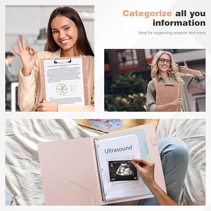 - 【Versatile】1 inch sturdy round ring, can hold 200 sheets of paper securely. The interior features two pockets to store letter-sized documents and important loose papers. Also comes with a divider for 5 tabs and a sheet of stickers (the tabs fit perfectly into the divider) for easy organization. The design of the clipboard is convenient for fixing paper and taking it out for writing at any time.