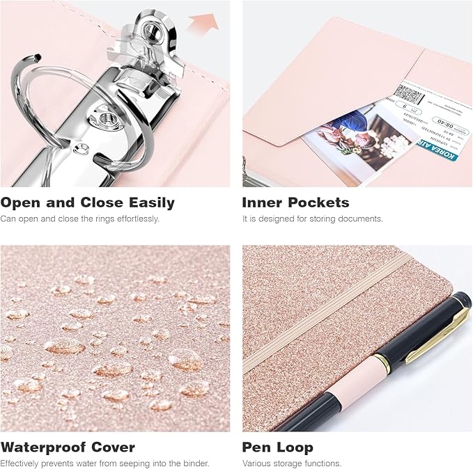 Ospelelf 3 Ring Binder 1 Inch, Vintage Leather Clipboard Binder Organizer for Letter Size (8.5" x 11"), Professional Binder Organizer Dividers with 5 Tabs, Rose Gold