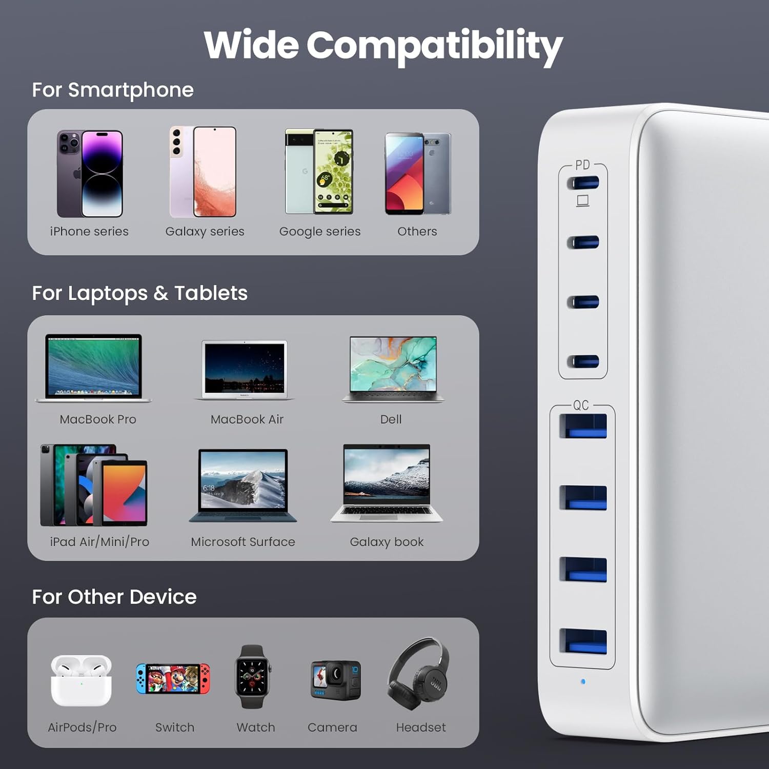 USB C Charger 200W USB C Charger Block,Upgraded GaN III 8-Port Fast Charging Station Hub,PD 65W Laptop Charging Adapter Compatible with MacBook Pro/Air,DELL,Steam Deck,iPhone 16/15/14,Galaxy S23/22