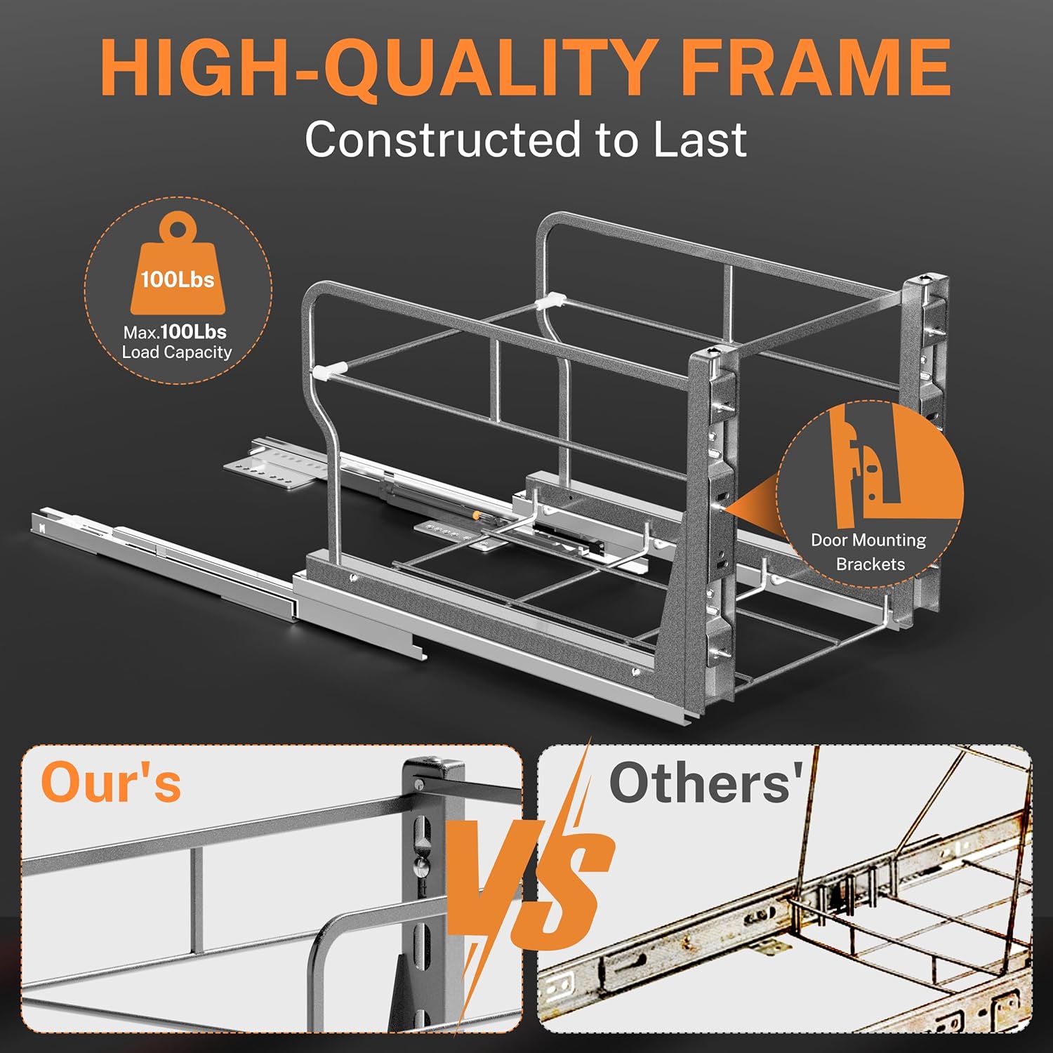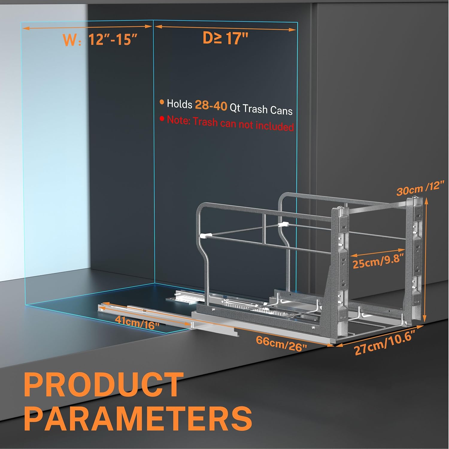 - Premiun Material: Trash can cabinet pull out is made of high-quality carbon steel with powder-coating surface for durability and rust resistance, allowing you to clean it with a cloth. Made for a trash can kitchen of 28 to 40 quarts (7–10 gal, 26–37 l) in volume, the frame can carry 100 pounds, 50 pounds more than regular slides.