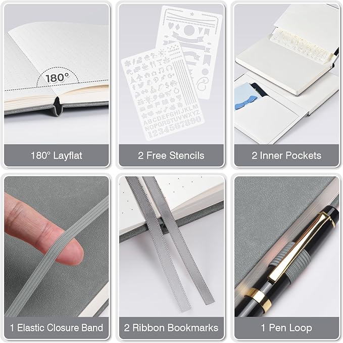 - 【Thoughtful Accessories】Complete with practical accessories, each bullet dotted journal book includes 2 pockets, 2 bookmark ribbons, 1 elastic band, and 1 pen loop. Additionally, each set comes with 2 free dot grid journal stencils featuring various graphics, letters, and numbers, enhancing creative possibilities for planning, documenting work, or artistic endeavors.