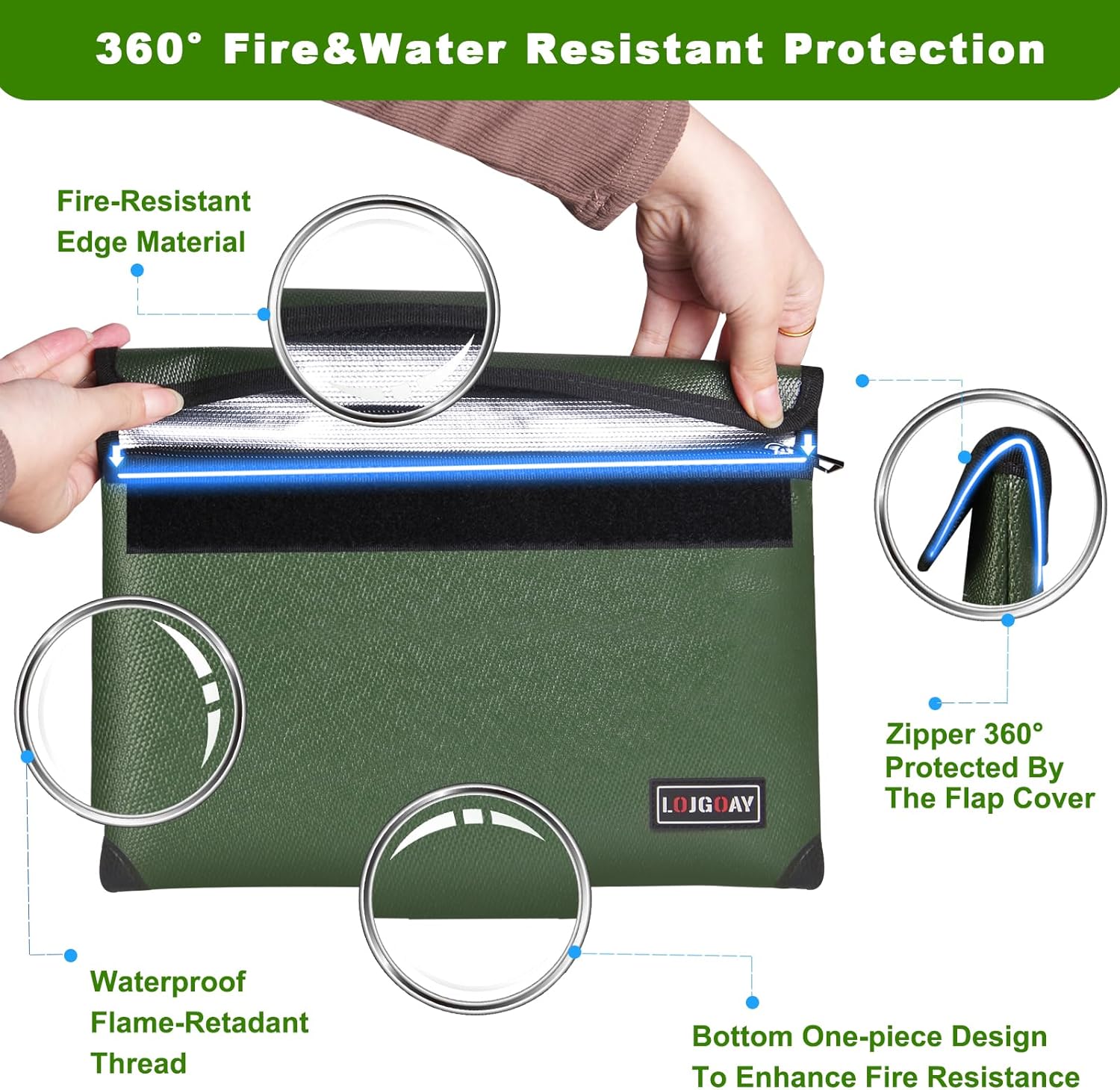 Fireproof Document Bag - with 5200°F Heat Insulated, Waterproof Fireproof Bag with Zipper, Fireproof Money Bag for Cash/Documents/Valuables, Fire bag (Green, 11"x7.7")