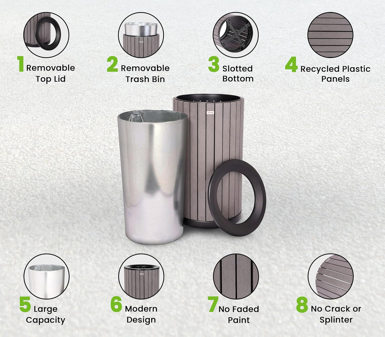 - CLASSIC DESIGN: The Alpine Outdoor Trash Can has great design that blends in naturally in any environment, while keeping them clean and litter free. With a grey classic look, this trash can will be the perfect addition to any area without drawing any extra attention.