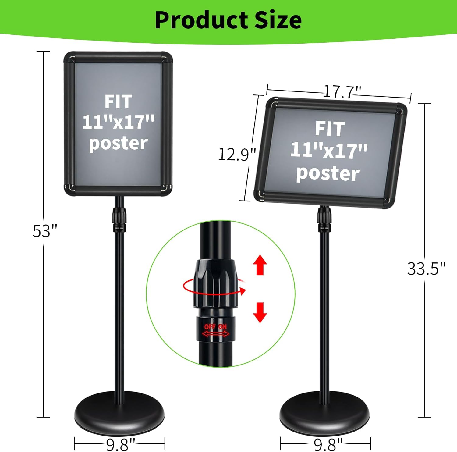 - ADJUSTABLE VIEW: INNOVSIGN 11 x 17inch adjustable floor sign stand height is between 33.5" and 53" tall, the poster frame page can be rotated 360 degrees freely, which is convenient for people to browse in different directions.