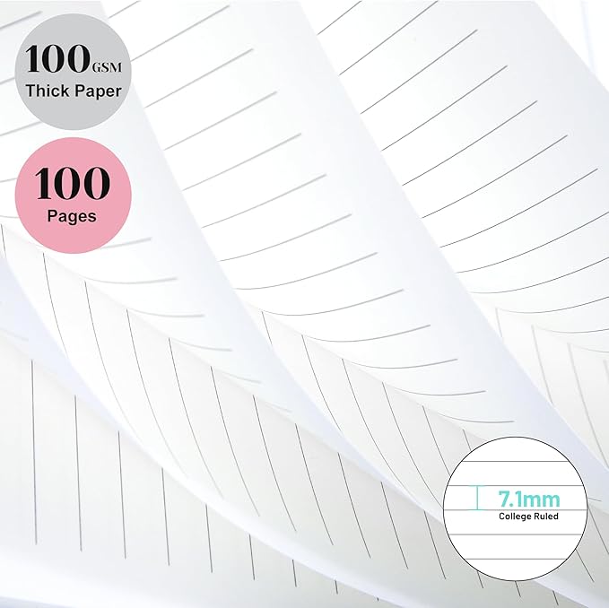 - 100 GSM High-quality Paper -- This college ruled notebook uses 100gsm premium acid-free paper, 7.1mm, which is thicker than traditional paper, can write on both sides๏ผ no ink feathering and bleeding. Suitable for most pen types. 50 sheets/100 pages lined paper, It can provide you with a lot of creative space.