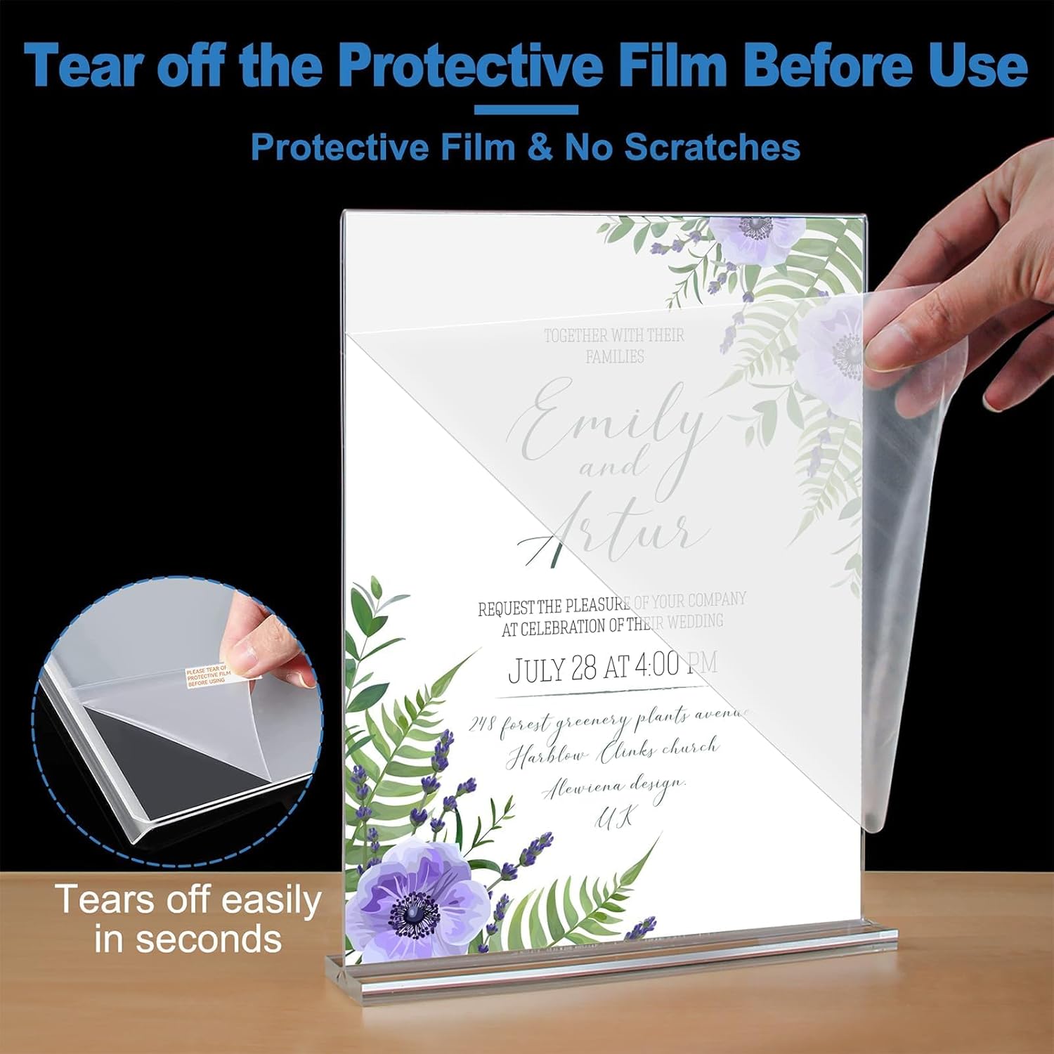 - Easy to Use: Insert 4 anti-slip pads into the base, Each of our Acrylic Sign Holder comes with a peel off film guide, follow the red arrows to peel off the film in seconds, Bottom-loading your paper
