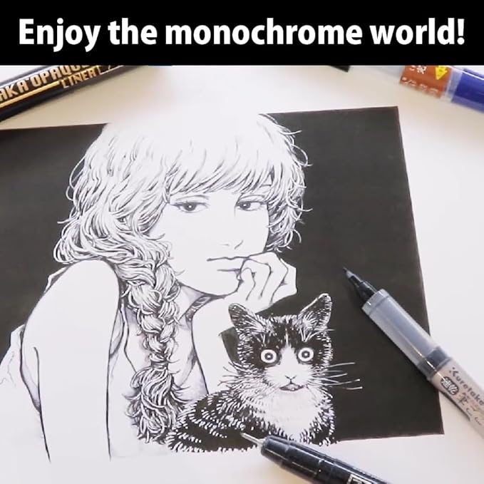 - [ZIG Cartoonist MANGAKA OPAQUE LINER] This lightfastness and opaque water-based pigment ink offers high coverage, allowing you to enjoy vivid colors stading out on dark papers. Once the ink dries, it wonβt wash away with water and good for layering.