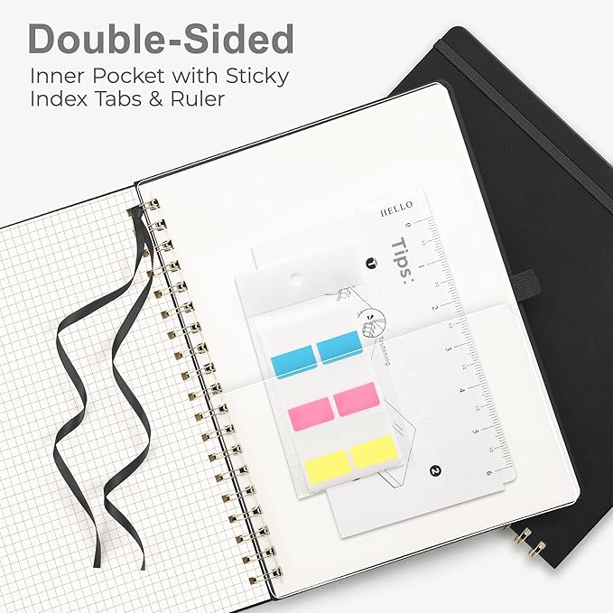 - GRAPH PAPER NOTEBOOK: RETTACY Graph Notebook comes in a A4 (8.5'' × 11'') size, 110 Pages, Leather Hardcover, Sturdy Twin-wire Spiral Bound, 5 mm grid writing space, 100 GSM Paper, Pen Holder, Elastic Closure Bands, Inner Pocket, Ribbon Bookmark, Lightweight Ruler, Sticky Index Tabs