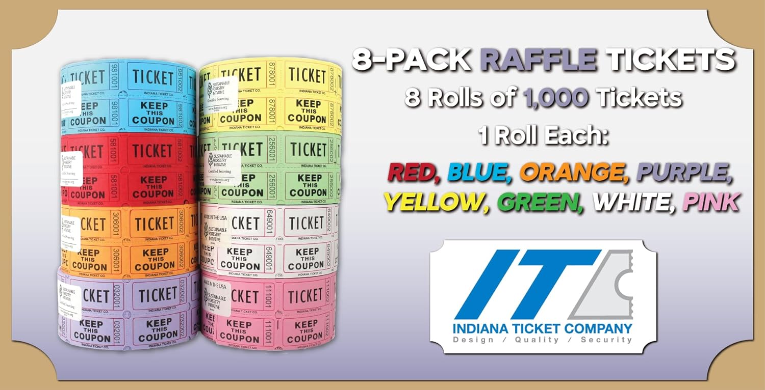 - BRIGHT COLORS –This 8-Pack includes 1 Roll each Red, Blue, Orange, Purple, Green, White, Pink & Yellow. Each INDIANA TICKET CO. roll includes 1,000 raffle tickets. The tickets are 2” x 2", separated into two 1”x 2" portions.
