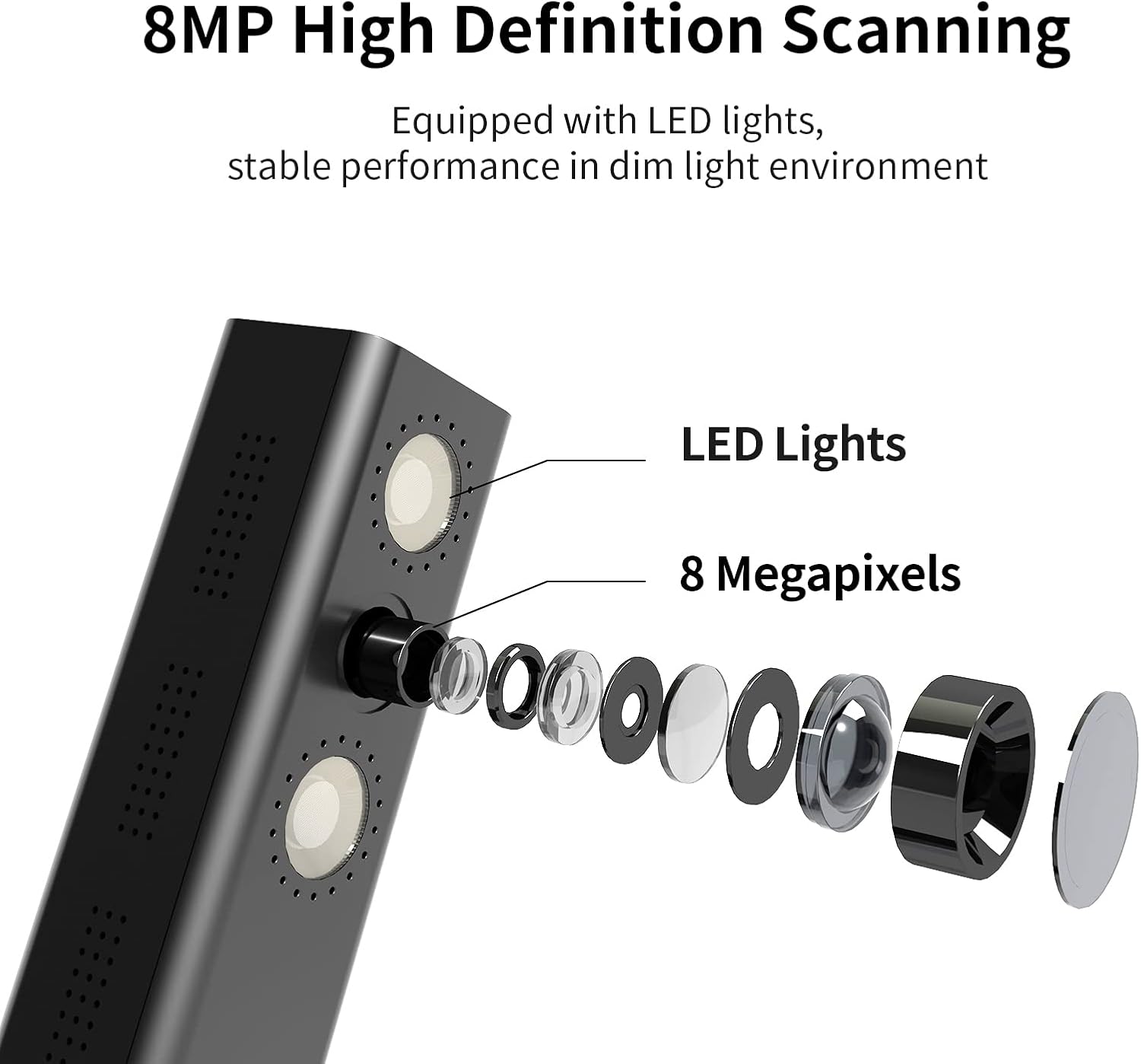 - Excellent Performance: Includes a 8MP camera (resolution: 3264*2448) and LED lights with adjustable brightness. Shine800 has a variety of useful features such as OCR, automatic tilt correction, front and back combination, etc. Notice: glossy materials(glossy photo,glossy magzine)are NOT recommended