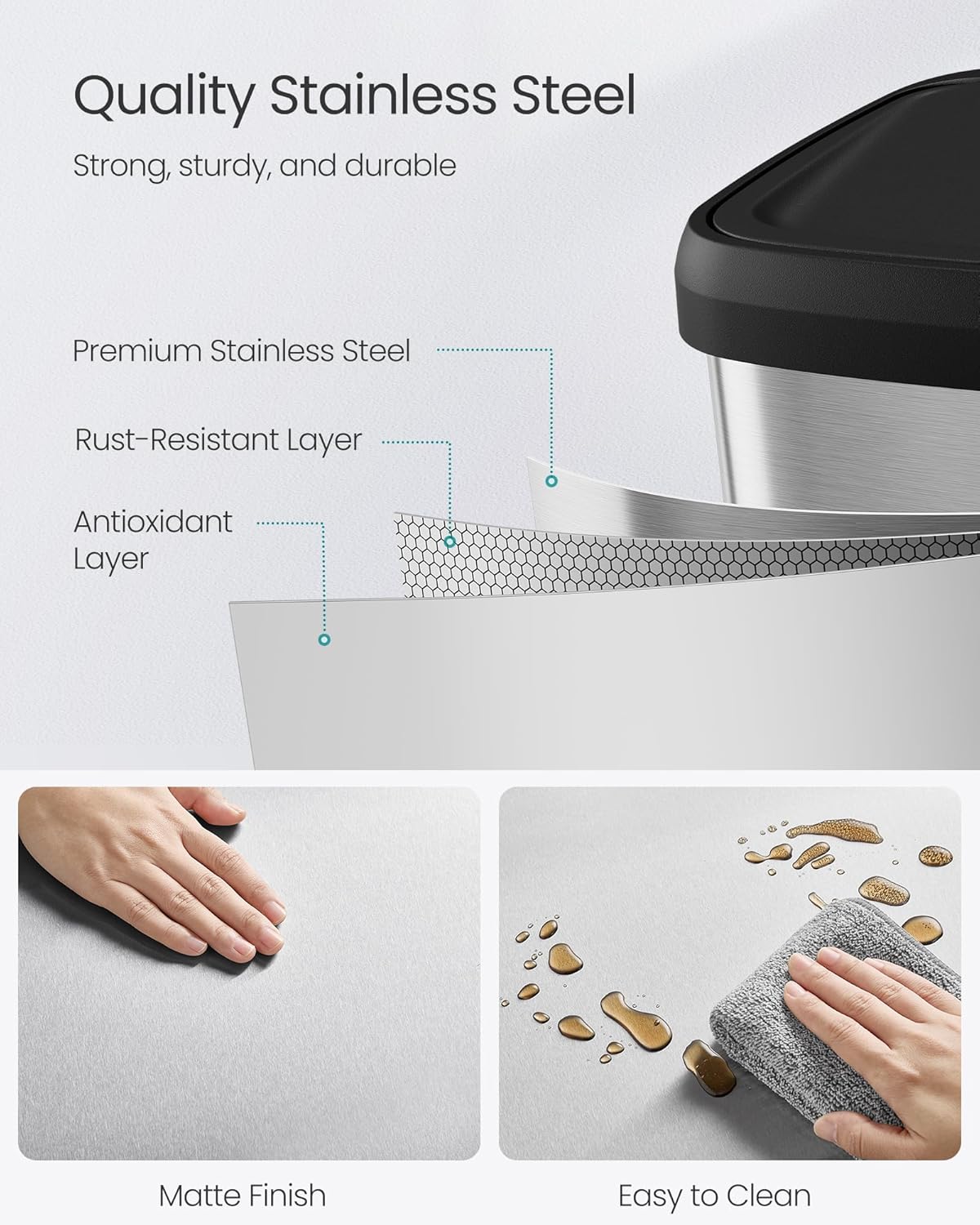 - [Quality Stainless Steel] Made from stainless steel, this trash can is rust-resistant and easy to clean. It adds a stylish modern touch to any kitchen