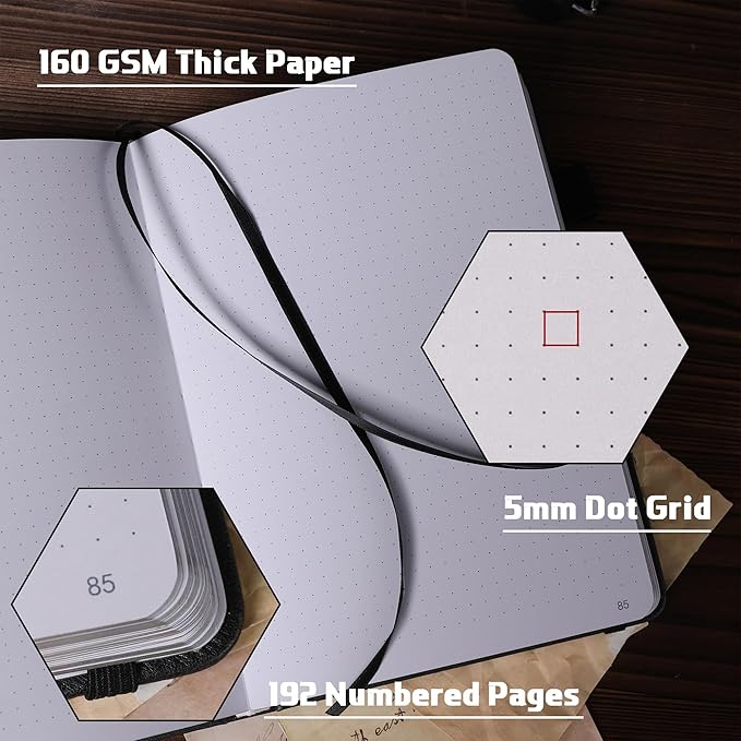 - 160 GSM Thick Paper: The dot matrix journal is made of 160gsm extra thick paper, drawing and writing won’t penetrate the ink, this is tested by us, the writing surface is white and acid-free, there are 190 numbered pages, each page is numbered, the dots are 0.5 cm, leaving enough space for your imagination.