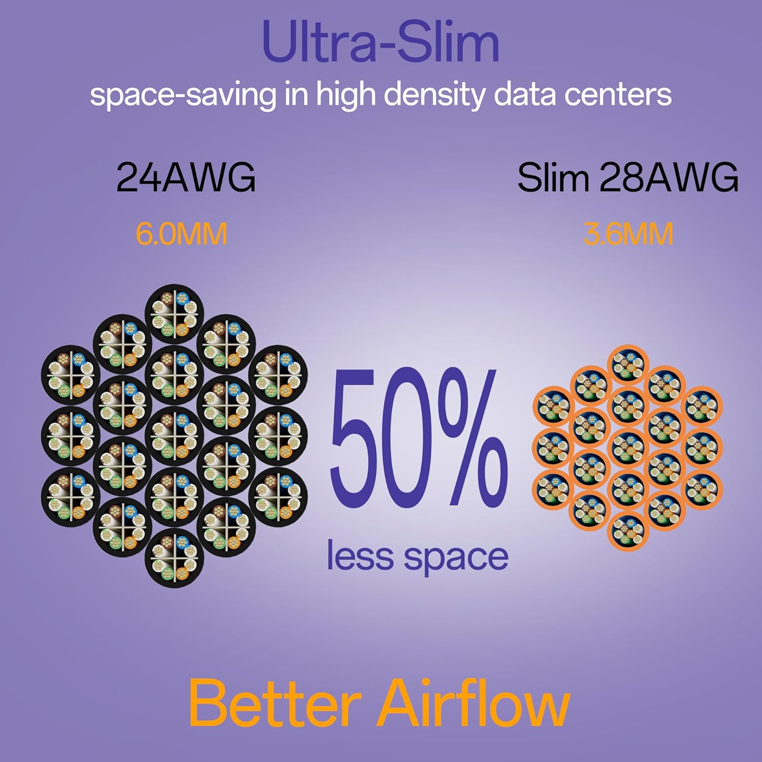 - Better Airflow: With cable diameter of only 3.6mm, the slim Cat6 cable is much thinner and lighter than the standard Cat6 cable, which allows better airflow and heat dissipation in tight spaces.