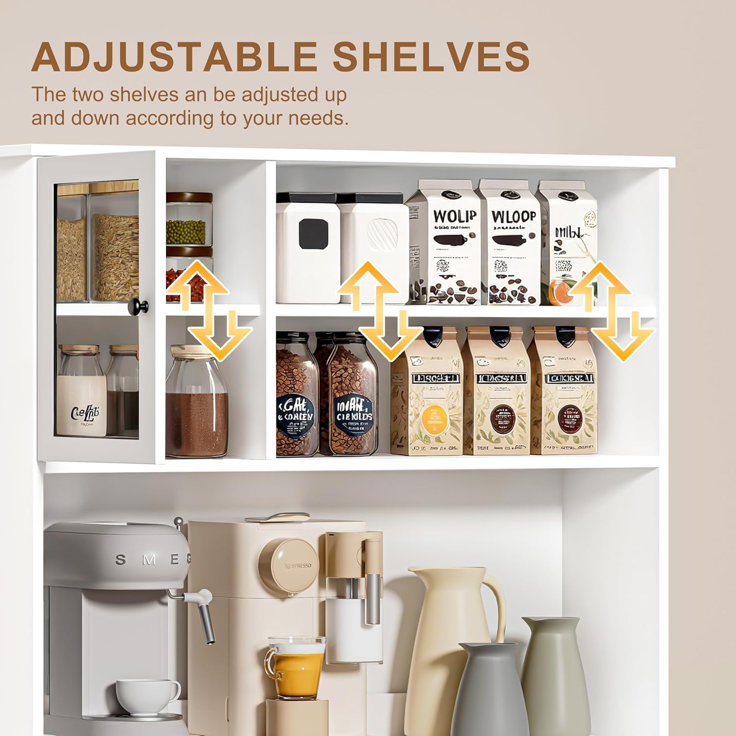 - 【Kitchen Storage Cabinet】The freestanding kitchen hutch with microwave worktop, drawers, glass cabinet door storage and open adjustable storage shelves ensures that every user has enough space to store their essentials, as well as dividers that can be adjusted to suit their needs.