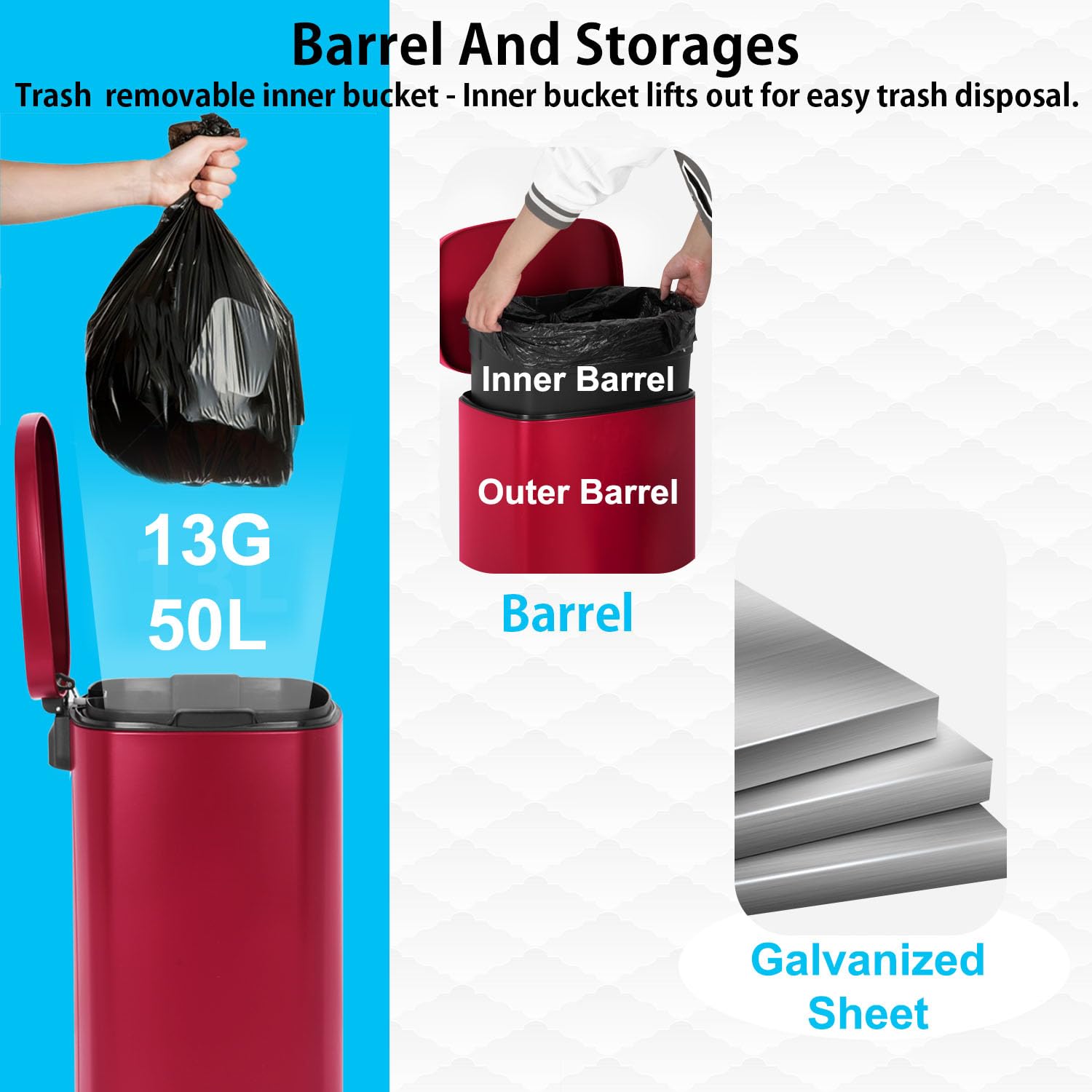 - 13 Gallon Ultra-large Capacity: 13 gallons can absolutely meet your daily use, in the kitchen table next to a kitchen trash can, you will be more convenient to deal with kitchen waste. The regular 13-gallon garbage bag in the supermarket can be used in our stainless steel trash can, and it's kind of you to use a bigger bag. The lid of the garbage can is removable, it’s convenient for you to put in and take out the garbage bag.step trash can kitchen trash can bedroom trash can