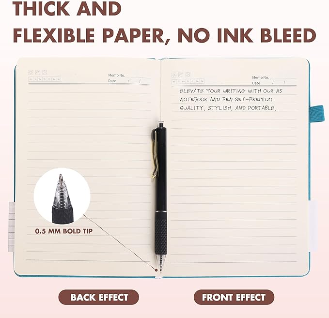 - Quality leather & paper: our A5 notebooks are made of 100 gsm thick paper, providing a smooth touch and resisting ghosting and bleeding, compatible with most pens, pencils and markers; the lined journal notebook with pens feature premium PU leather hardcover, waterproof and easy to clean, helping the notebooks stay upright without the pages curling or bending; the ballpoint pen is designed with a 0.5 mm bold tip for smooth, non-leaking drawing, ideal for use with the journal