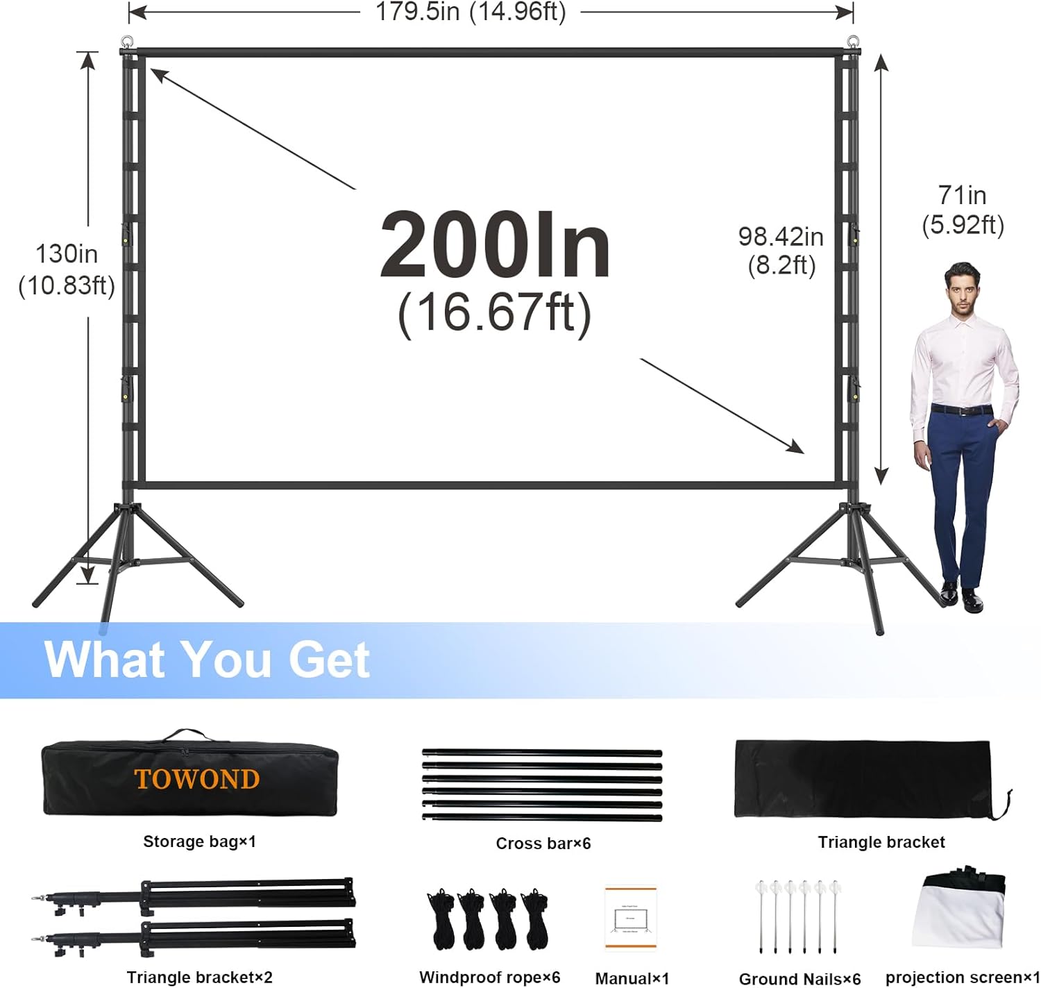 Outdoor Projector Screen with Stand, TOWOND 200 Inch Portable Projection Screen - Dual-Sided 16:9 4K HD Movie Screen, Wrinkle-Free Design & Carry Bag for Backyard Cinema