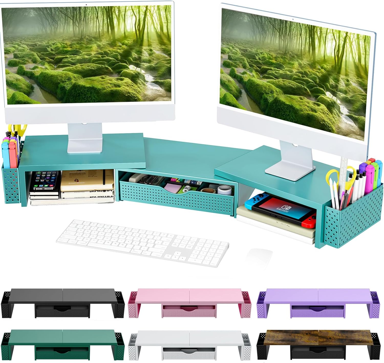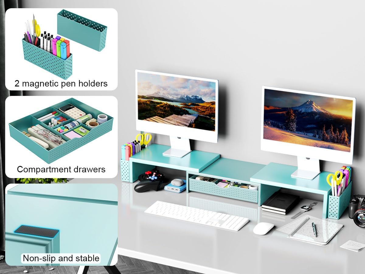 Spacrea Metal Desk Organizers and Accessories, Dual Monitor Stand Riser with Drawer and 2 Pen Holders, Desk Accessories & Workspace Desktop Organizers for Office Supplies (Blue)