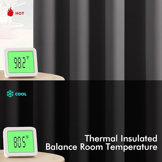 - High-Quality Material: Crafted from high-quality 225GSM polyester fabric, these curtains offer enhanced durability and elegant drape. The soft blackout material features triple-layer weaving technology, with a middle layer of black yarn for superior light blocking and privacy. Both sides feature the same refined color, ensuring a seamless look that elevates your home’s aesthetic with understated sophistication