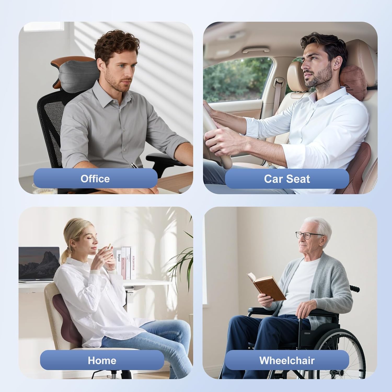 - Universal Compatibility:This neck pillow and lumbar support set is highly versatile, not only for car seats, but also for office chairs, wheelchairs and other seat scene, the neck pillow features an adjustable strap that can be tightened or loosened to fit securely on different seat headrests