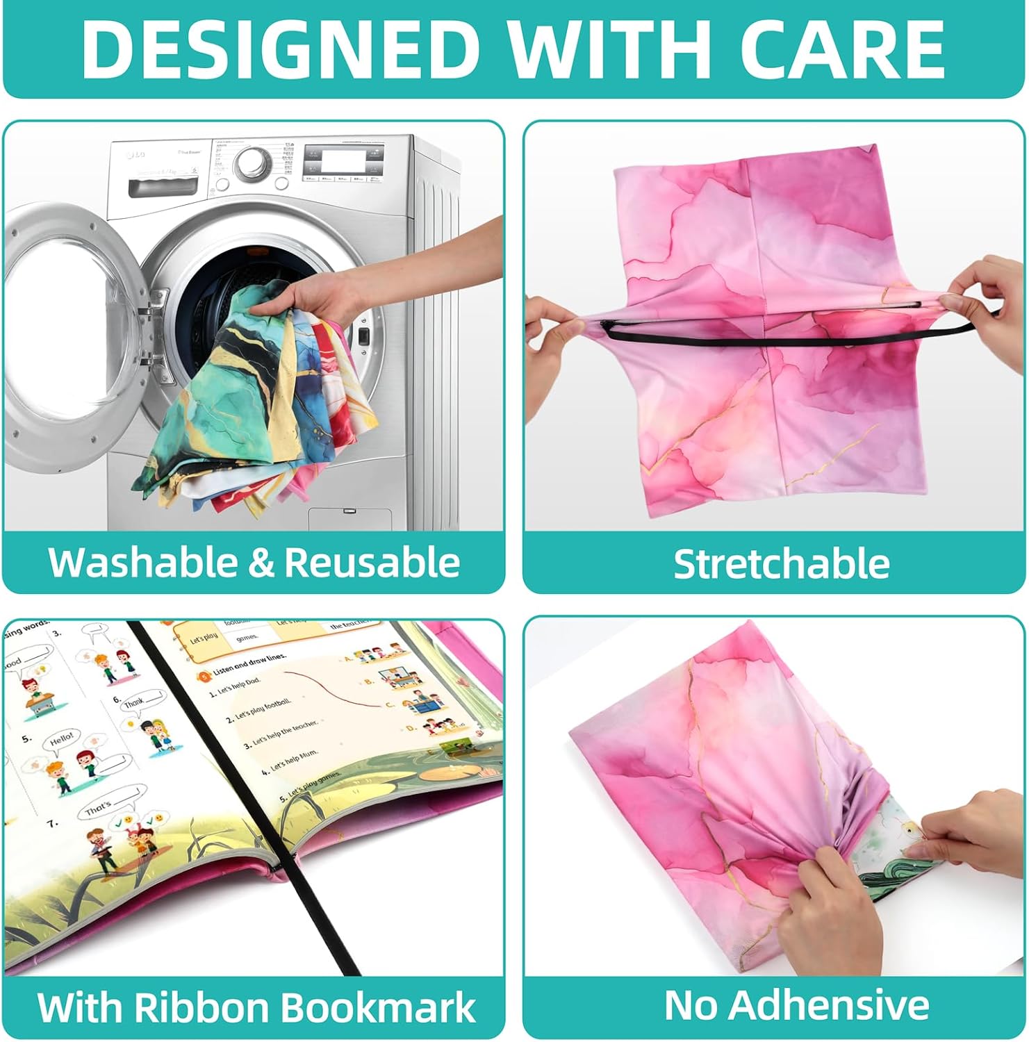 - Jumbo Stretchable Book Covers – Elastic fabric fits books up to 9 x 11 in. Washable and reusable—great for school and everyday use.