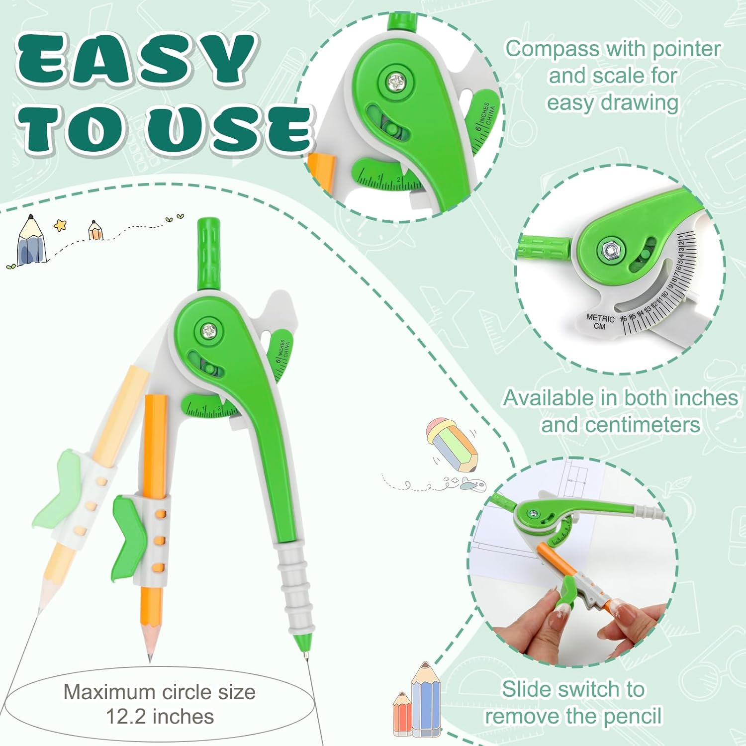 - Dual Scale Design: Featuring both inch and centimeter scales for precise and convenient measurement. Suitable for extended use, the math compass's hardened point allows accurate marking and stable operation. (Note: The math compass tip is sharp and hard; please handle with care to avoid injury.) An essential geometry tool for any math projects